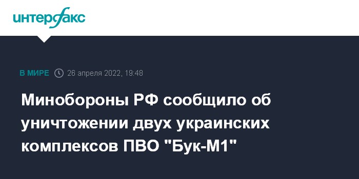 Москва. 26 апреля. INTERFAX.RU - Российская авиация и артиллерия уничтожили два украинских зенитных ракетных комплекса "Бук-М1", заявил официальный представитель Минобороны РФ Игорь Конашенков.