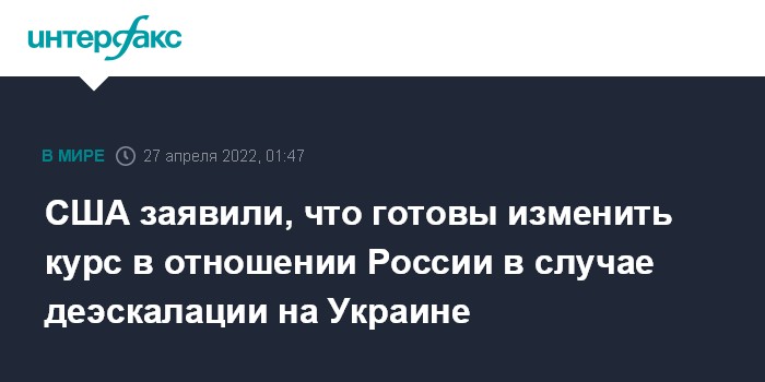 Москва. 27 апреля. INTERFAX.RU - США готовы изменить политику в отношении России в случае, если увидят от Москвы признаки изменения ее курса на Украине, заявил во вторник представитель Госдепа США Нед Прайс.