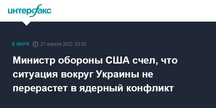 Москва. 27 апреля. INTERFAX.RU - Министр обороны США Ллойд Остин считает, что ситуация вокруг Украины не перерастет в ядерный конфликт.