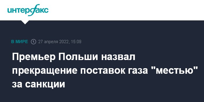 Москва. 27 апреля. INTERFAX.RU - Премьер-министр Польши Матеуш Моравецкий заявил сейму, что расценивает приостановку поставок российского газа как месть за санкции, которые Варшава ввела против России из-за ее действий на Украине, сообщает AР.