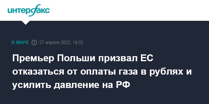 Москва. 27 апреля. INTERFAX.RU - Глава правительства Польши Матеуш Моравецкий в среду призвал коллег по ЕС не платить России за газ в рублях, передает польское телевидение.