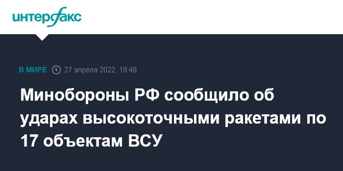 Москва. 27 апреля. INTERFAX.RU - Министерство обороны России сообщило, что высокоточными ракетами нанесены удары по 17 военным объектам Украины, уничтожены два командных пункта украинской армии.