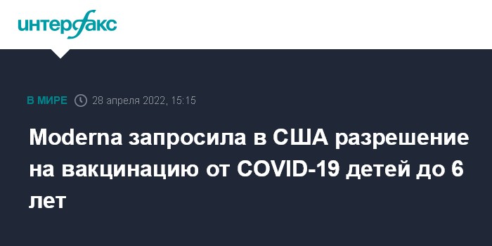 Москва. 28 апреля. INTERFAX.RU - Компания Moderna запросила у американского Управления по санитарному надзору за качеством пищевых продуктов и медикаментов (FDA) разрешение на вакцинацию от коронавируса COVID-19 детей до шести лет, сообщает в четверг Associated Press.