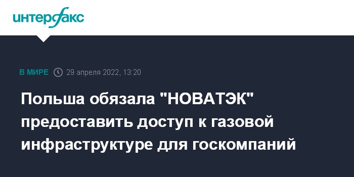26 апреля министерство внутренних дел Польши ввело санкции в отношении ПАО "Газпром", ПАО "НОВАТЭК", а также в отношении его местной дочерней компании Novatek Green Energy Sp. z o.o. (Краков).