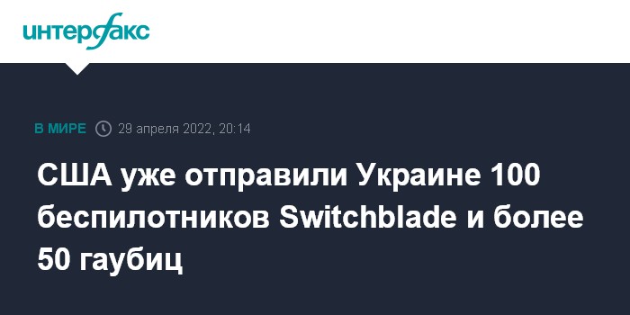Москва. 29 апреля. INTERFAX.RU - США направили Украине 100 из 700 запланированных для поставки беспилотников Switchblade. Об этом сообщил в пятницу журнал Foreign Policy со ссылкой на неназванного высокопоставленного представителя Пентагона.