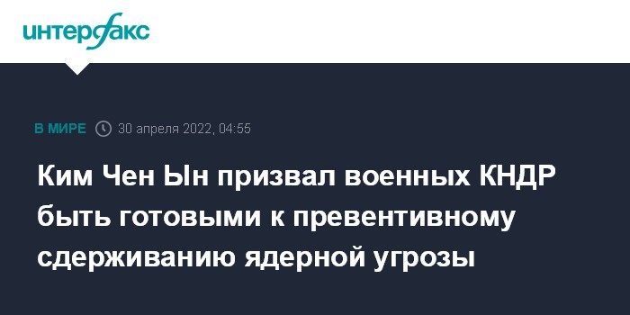 Москва. 30 апреля. INTERFAX.RU - Лидер КНДР Ким Чен Ын заявил, что армия страны должна быть готова к превентивным действиям для противостояния растущим ядерным угрозам, сообщило Центральное телеграфное агентство Кореи (ЦТАК).