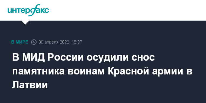 Москва. 30 апреля. INTERFAX.RU - Снос памятника советским воинам в поселении Мадлиена в Латвии окажет негативное влияние на весь комплекс российско-латвийских отношений, заявляют в МИД РФ.