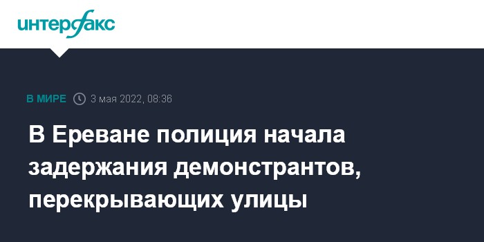 Москва. 3 мая. INTERFAX.RU - Полиция Армении проводит задержания демонстрантов, перекрывающих улицы в центре Еревана в рамках объявленных оппозицией акций гражданского неповиновения, передает корреспондент "Интерфакса".