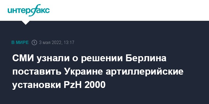 Москва. 3 мая. INTERFAX.RU - Правительство Германии приняло решение поставить Украине самоходные артиллерийские установки PzH 2000 (нем. Panzerhaubitze 2000), сообщает во вторник газета Welt.