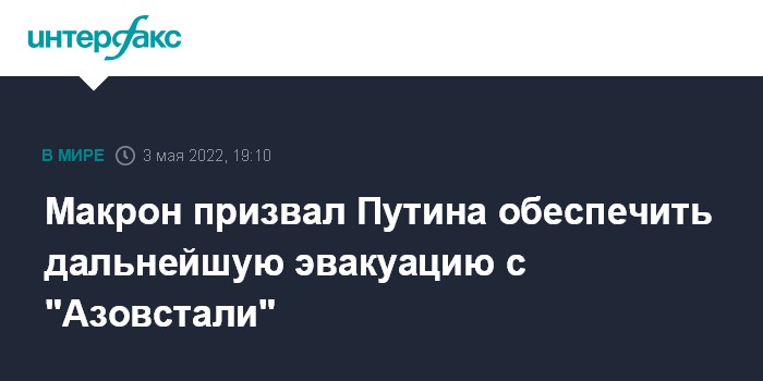 Москва. 3 мая. INTERFAX.RU - Президент Франции Эммануэль Макрон во вторник в телефонном разговоре с президентом РФ Владимиром Путиным призвал Россию обеспечить продолжение эвакуации с завода "Азовсталь" в Мариуполе, говорится в пресс-релизе Елисейского дворца.