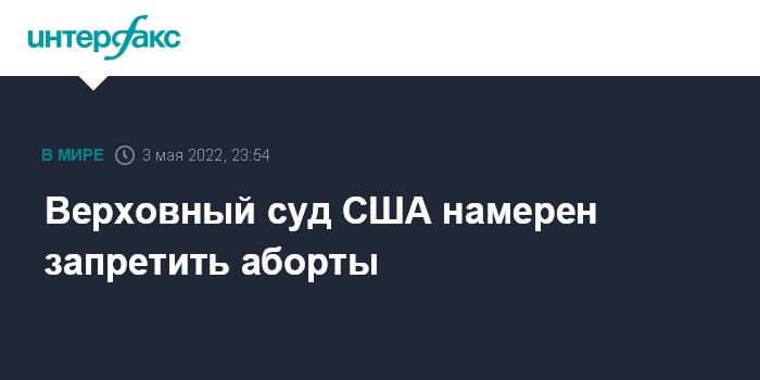 Москва. 3 мая. INTERFAX.RU - Верховный суд США проголосовал за запрет абортов, сообщает издание Politico. Имеется ввиду пересмотр прецедента 1973 г., который стал основой для легализации абортов по всей стране.