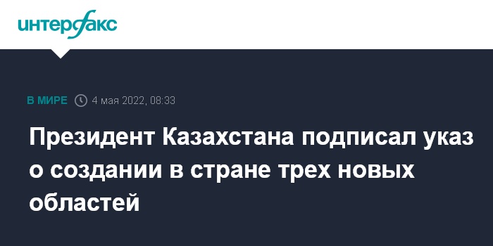 Москва. 4 мая. INTERFAX.RU - Президент Казахстана Касым-Жомарт Токаев подписал о создании трех новых областей в республике, сообщила пресс-служба главы государства. Указ вступит в силу 8 июня 2022 года.