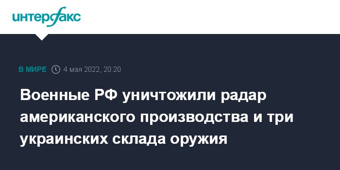 Москва. 4 мая. INTERFAX.RU - Высокоточными ракетами воздушного базирования ВКС России в течение дня уничтожены четыре артиллерийских батареи на огневых позициях и три склада боеприпасов, сообщил официальный представитель министерства обороны РФ Игорь Конашенков на брифинге в среду.