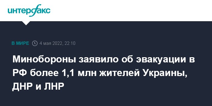 Москва. 4 мая. INTERFAX.RU - Минобороны РФ заявило, что более 1,1 млн жителей районов Украины, Донецкой и Луганской народных республик эвакуированы в Россию с начала специальной военной операции, среди них почти 200 тысяч - дети.