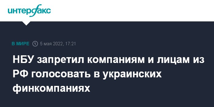 Москва. 5 мая. INTERFAX.RU - Национальный банк Украины (НБУ) запретил гражданам РФ, лицам, которые проживают в РФ, и российским компаниям, которые являются собственниками существенного участия (от 10%) в страховых, лизинговых, финансовых и факторинговых компаниях прямо или опосредованно, голосовать и принимать участие в управлении компанией до отмены военного положения на Украине.