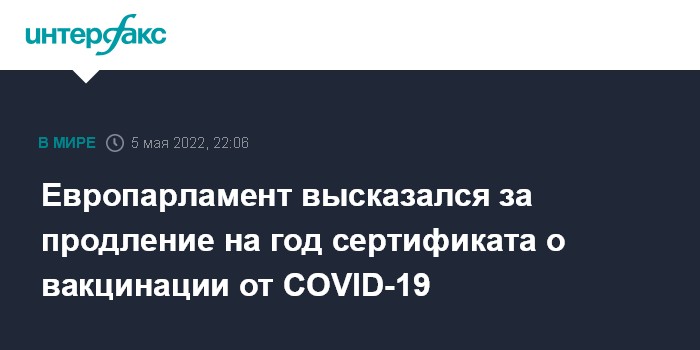 Москва. 5 мая. INTERFAX.RU - Цифровой сертификат ЕС о вакцинации или перенесенном заболевании COVID-19 должен быть продлен до июня 2023 года - к такому выводу пришли европейские депутаты на сессии Европарламента (ЕП) в четверг в Страсбурге.