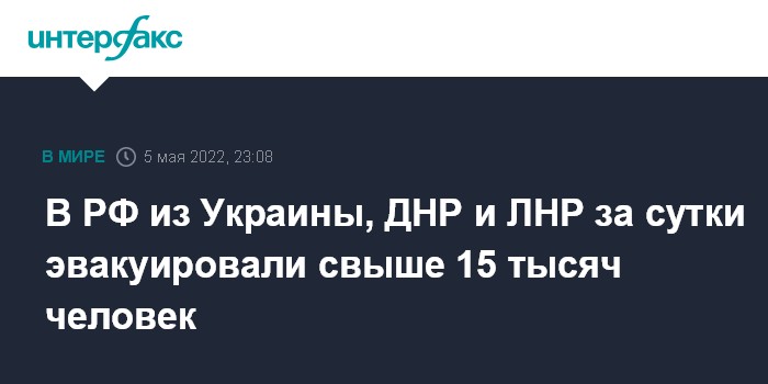 Москва. 5 мая. INTERFAX.RU - В течение минувших суток на территорию России из Донецкой и Луганской республик, а также украинских населенных пунктов вывезены более 15 тысяч человек, сообщил начальник Национального центра управления обороной РФ Михаил Мизинцев на брифинге в четверг.