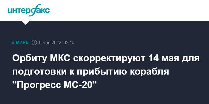 "Очередная коррекция высоты орбиты Международной космической станции планируется на 14 мая 2022 года с целью формирования баллистических условий перед запуском грузового корабля "Прогресс МС-20", - сообщили в пресс-службе госкорпорации.