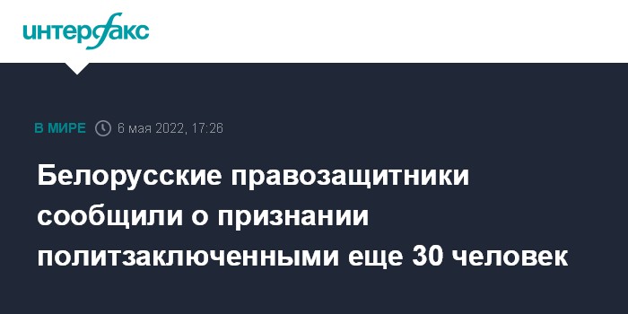 Москва. 6 мая. INTERFAX.RU - Еще 30 человек признаны политзаключенными в Белоруссии, сообщили в незарегистрированном в республике правозащитном центре "Весна" в пятницу.