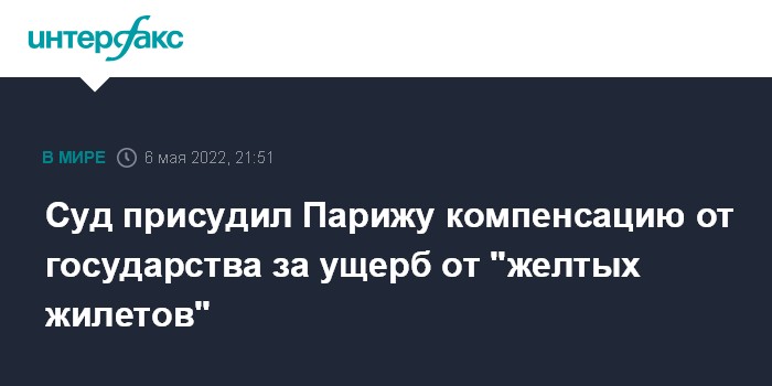 Москва. 6 мая. INTERFAX.RU - Суд обязал французское государство выплатить Парижу более 1,4 млн евро компенсации за ущерб, полученный во время манифестаций движения "желтых жилетов" в период с ноября 2018 года по декабрь 2019 года, пишет Le Figaro со ссылкой на коммюнике мэрии столицы.