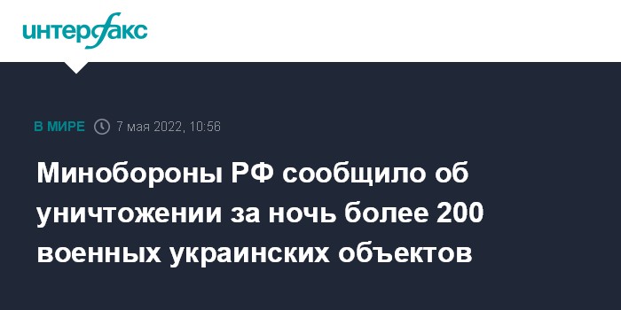 Москва. 7 мая. INTERFAX.RU - Российские военные сообщили, что за ночь артиллеристы уничтожили более 200 объектов ВСУ.