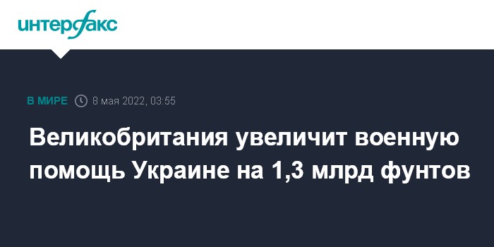 Москва. 8 мая. INTERFAX.RU - Великобритания намерена выделить на оказание военной помощи Украине дополнительно 1,3 млрд фунтов стерлингов (1,6 млрд долларов), сообщают британские СМИ со ссылками на власти страны.