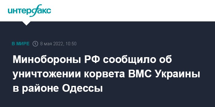 Москва. 8 мая. INTERFAX.RU - Российские военные сообщили, что уничтожили украинский военный корабль в районе Одессы.