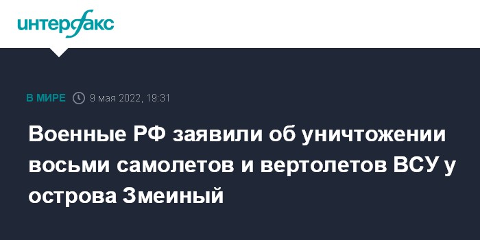 Москва. 9 мая. INTERFAX.RU - Российские военные за три дня уничтожили у острова Змеиный четыре украинских самолета и четыре вертолета, заявили в Минобороны РФ.