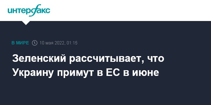 Москва. 10 мая. INTERFAX.RU - Президент Украины Владимир Зеленский рассчитывает на позитивное решение Европейского совета относительно предоставления Украине статуса кандидата в члены Европейского Союза уже в июне текущего года.