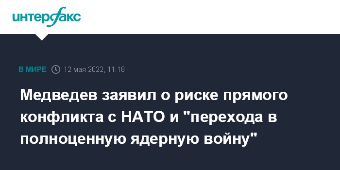 Москва. 12 мая. INTERFAX.RU - "Накачивание" Украины оружием стран НАТО повышает риск прямого столкновения государств альянса с Россией с риском перехода конфликта в полноценную ядерную войну, заявил замглавы Совбеза РФ Дмитрий Медведев.