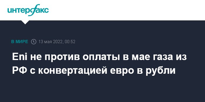 Москва. 13 мая. INTERFAX.RU - Итальянская нефтегазовая компания Eni S.p.A. готова заплатить "Газпрому" за поставки газа в мае, даже если потребуется, как этого просит РФ, конвертировать евро в рубли, сообщает Bloomberg со ссылкой на источники.