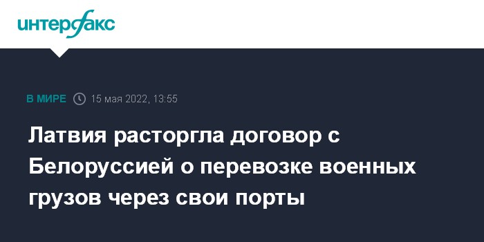 Москва. 15 мая. INTERFAX.RU - Латвия приняла решение о расторжении соглашения, разрешавшего прямое железнодорожное сообщение для перевозки военных грузов из Белоруссии в третьи страны через латвийские порты, заявило в воскресенье министерство сообщения Латвии.