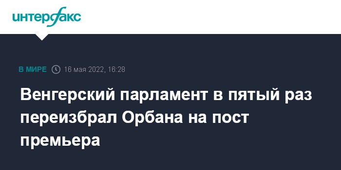 Москва. 16 мая. INTERFAX.RU - Парламент Венгрии в понедельник проголосовал за переизбрание Виктора Орбана на пост главы правительства, передают местные СМИ.
