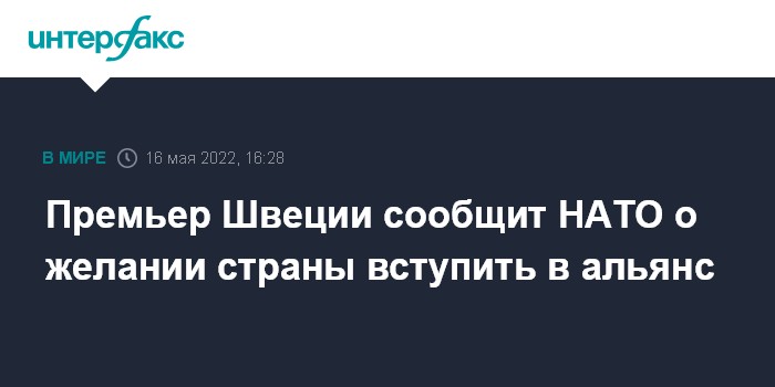 Москва. 16 мая. INTERFAX.RU - Премьер-министр Швеции Магдалена Андерссон в понедельник заявила, что проинформирует НАТО о желании ее страны стать членом Североатлантического альянса, сообщает шведское радио.