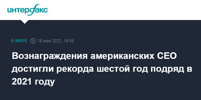 Москва. 16 мая. INTERFAX.RU - Компенсационные выплаты руководителям американских компаний в 2021 году установили рекорд по итогам шестого года подряд на фоне восстановления экономики после пандемии и повышения заработной платы сотрудников, пишет The Wall Street Journal.