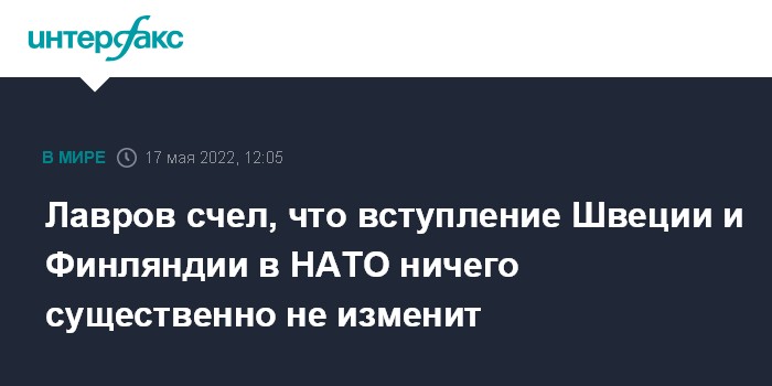 Москва. 17 мая. INTERFAX.RU - НАТО давно учитывает территорию Швеции и Финляндии в своем военном планировании, и вступление этих стран в Североатлантический альянс большой разницы не сделает, заявил во вторник глава МИД РФ Сергей Лавров.