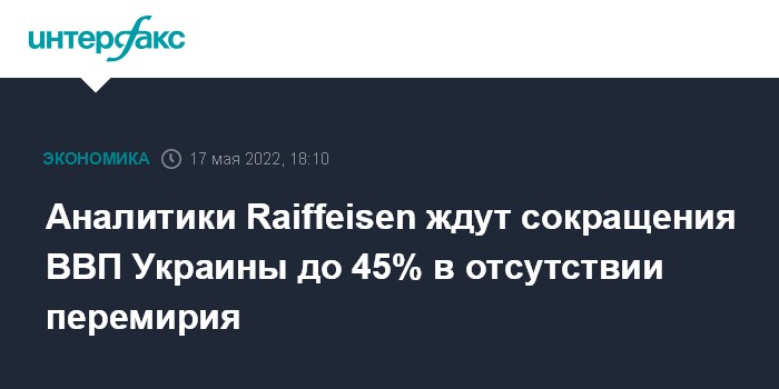 Москва. 17 мая. INTERFAX.RU - В 2022 года экономика Украины сократится на 35-36%, а если военная операция там продлится до конца года, спад достигнет 45%, заявил журналистам ведущий аналитик украинского Райффайзен банка (входит в группу Raiffeisen) Александр Печерицын.