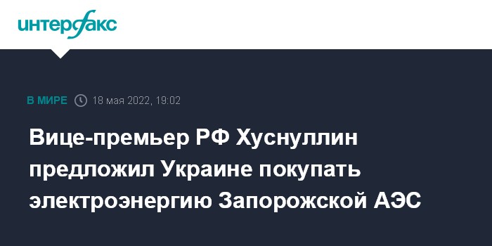 Москва. 18 мая. INTERFAX.RU - Россия готова продавать Украине электроэнергию со взятой под контроль российскими военными Запорожской АЭС, если у нее будет желание эту электроэнергию купить, заявил вице-премьер РФ Марат Хуснуллин в среду после инспекции Мелитополя (Запорожская область).