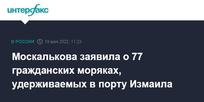 Москва. 19 мая. INTERFAX.RU - Украинские власти удерживают в порту Измаила (Одесская область) 77 российских гражданских моряков, заявила в четверг уполномоченный по правам человека в РФ Татьяна Москалькова.