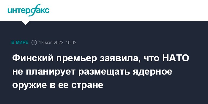 Москва. 19 мая. INTERFAX.RU - Руководство НАТО не выражало стремления разместить ядерное оружие или постоянные базы в Финляндии в случае вступления этой страны в альянс, заявила финский премьер Санна Марин в ходе визита в Италию.