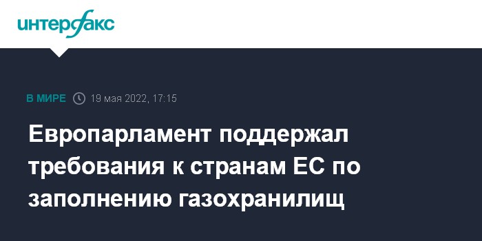 Москва. 19 мая. INTERFAX.RU - Совет ЕС объявил, что достигнуто предварительное соглашение с Европарламентом по изменению законодательства Евросоюза о заполнении газохранилищ.