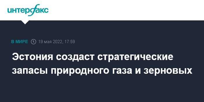 Москва. 19 мая. INTERFAX.RU - Правительство Эстонии на заседании в четверг отдало распоряжение Центру государственного резерва страны (Eesti Varude Keskus) сформировать запас природного газа в эквиваленте не менее 1 ТВт.ч, а также стратегический запас зерновых в объеме не менее 7,5 тыс. тонн.