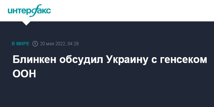 Москва. 20 мая. INTERFAX.RU - Госсекретарь США Энтони Блинкен на состоявшейся в Нью-Йорке встрече с генеральным секретарем ООН Антонио Гутерришем обсудил вопросы, касающиеся ситуации вокруг Украины, сообщил американский Госдепартамент.
