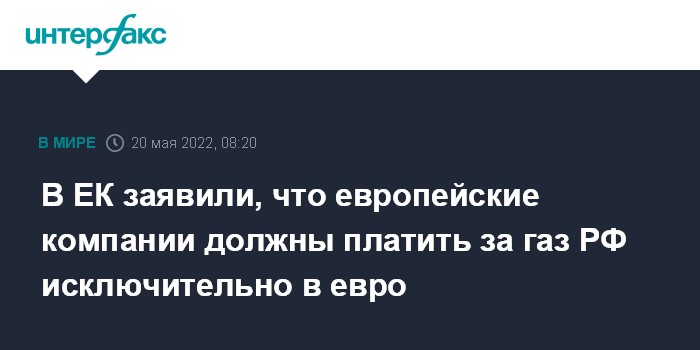 Москва. 20 мая. INTERFAX.RU - Европейские компании должны оплачивать российский природный газ исключительно в евро, заявил вице-президент Европейской комиссии Франс Тиммерманс.
