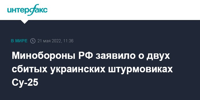 Москва. 21 мая. INTERFAX.RU - Российская авиация и средства ПВО сбили два украинских самолета Су-25 в Херсонской области и ДНР, заявили в субботу в Минобороны РФ.