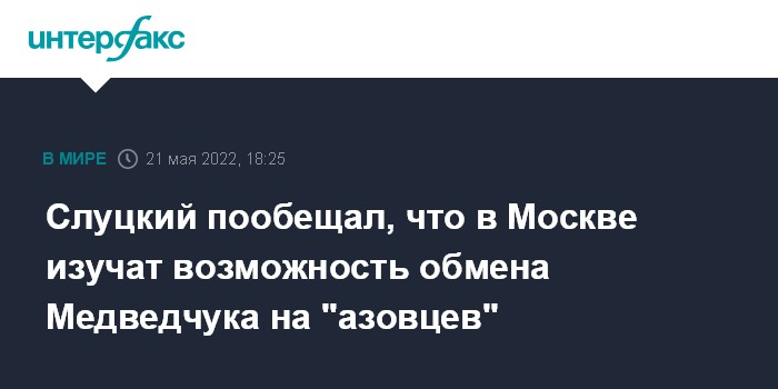 Москва. 21 мая. INTERFAX.RU - В Москве намерены изучить вопрос возможности обмена задержанного Службой безопасности Украины политика Виктора Медведчука на украинских пленных, заявил член переговорного процесса, председатель комитета Госдумы по международным делам и глава фракции ЛДПР Леонид Слуцкий.