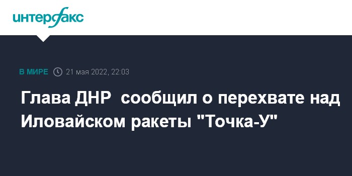 Москва. 21 мая. INTERFAX.RU - Силы ПВО ДНР перехватили ракету "Точка-У" над тыловым городом Иловайск, пострадали двое мирных жителей, заявил глава Донецкой народной республики Денис Пушилин.