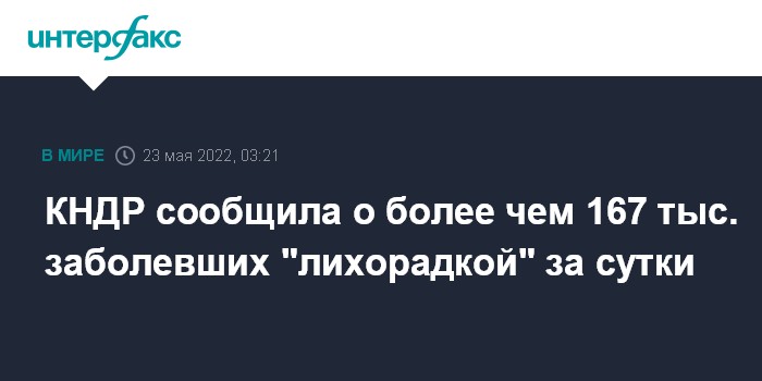 Москва. 23 мая. INTERFAX.RU - В Северной Корее за последние сутки более 167 тыс. человек заболели тем, что Пхеньян называет "лихорадкой", один человек умер от последствий заражения, сообщает северокорейское информагентство ЦТАК.