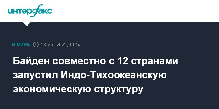 Москва. 23 мая. INTERFAX.RU - Президент США Джо Байден во время поездки в Южную Корею и Японию совместно с 12 партнерами из региона запустил "Индо-Тихоокеанскую экономическую структуру" (IPEF), сообщили в понедельник в Белом доме.