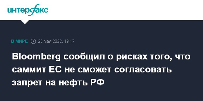 Москва. 23 мая. INTERFAX.RU - Вероятность того, что саммиту ЕС на следующей неделе не удастся согласовать эмбарго на нефть РФ, растет, так как Венгрия продолжает выступать против этого шага, сообщает в понедельник Bloomberg со ссылкой на анонимные источники.